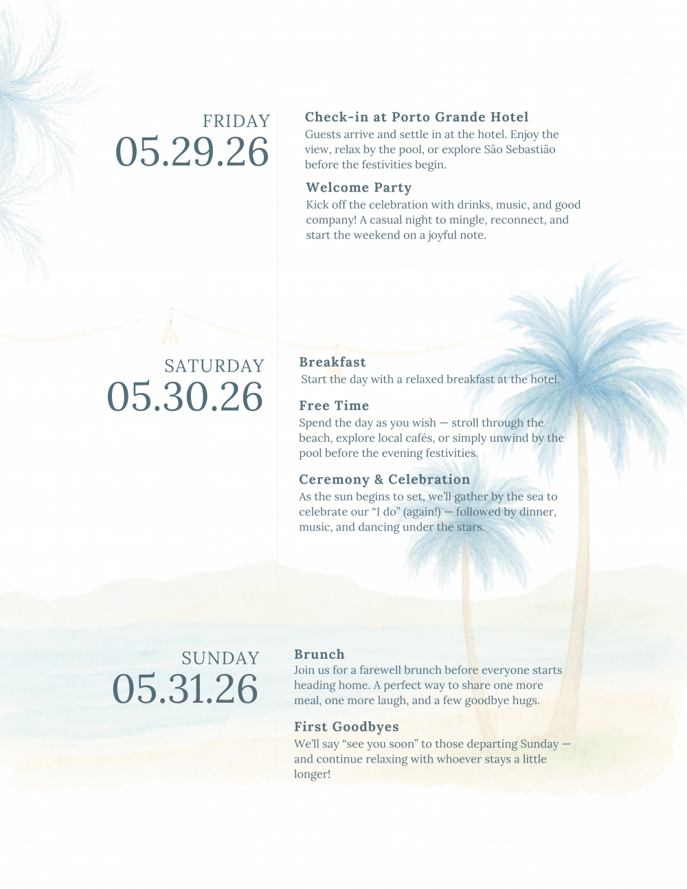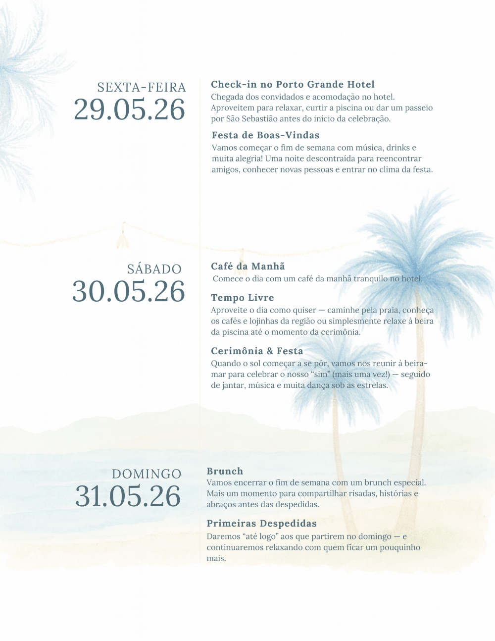 Recomendamos chegar na sexta-feira, 29 de maio de 2026, e partir na segunda-feira, 1º de junho de 2026, para aproveitar toda a experiência do casamento.